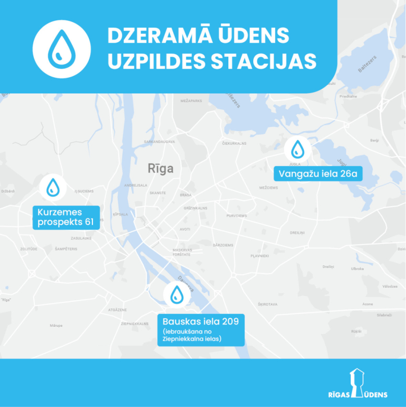 SIA “Rīgas ūdens” ierīkojis trīs pašapkalpošanās dzeramā ūdens uzpildes stacijas Kurzemes prospektā 61, Bauskas ielā 209 un Vangažu ielā 26a, lai sniegtu jaunu maksas pakalpojumu – iespēju uzpildīt dzeramo ūdeni klienta nodrošinātā tvertnē. Tās darbojas līdzīgi kā degvielas uzpildes stacijas, tikai norēķini tiek veikti nevis skaidrā naudā vai ar bankas karti, bet klientam noslēdzot tipveida līgumu un norēķinoties ar uzņēmumu pēc patērētā.